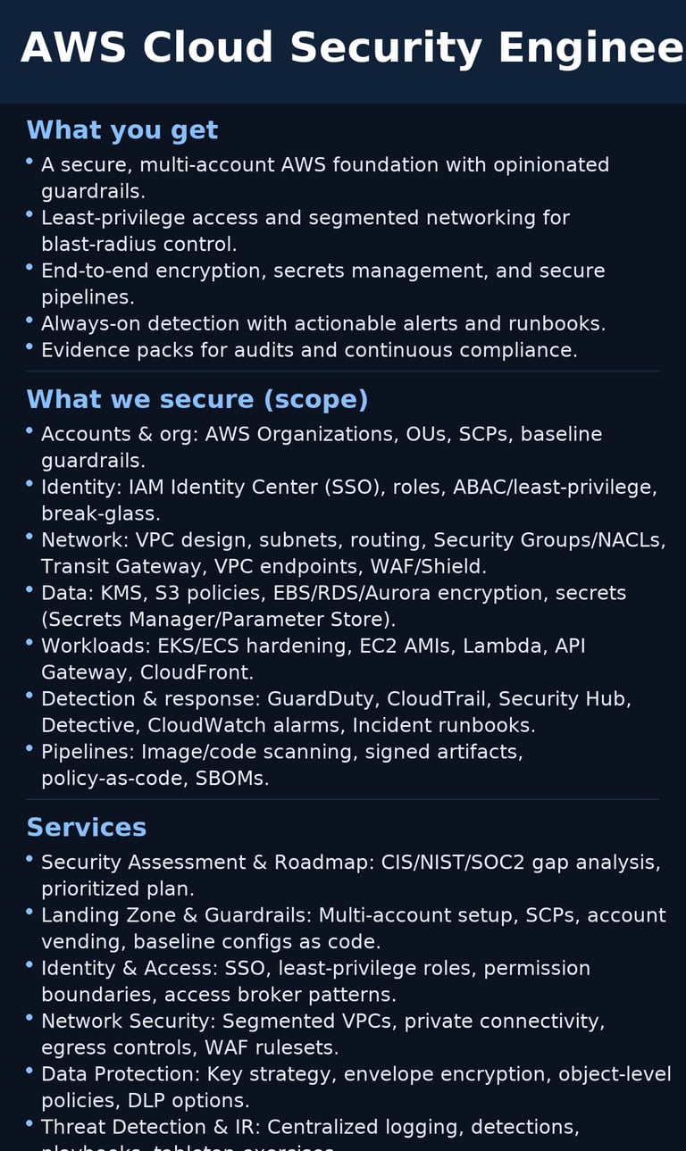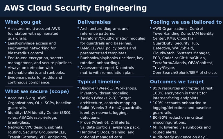 Secure-by-design workloads and data on AWS. Identity & access, network segmentation, data protection, threat detection, compliance guardrails, and DevSecOps—implemented with Infrastructure as Code and measured controls.